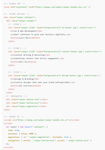 • If your homepage is in HTML/CSS/JS, use a lightweight slider library like Swiper.js, Slick Slider, or custom CSS transitions.